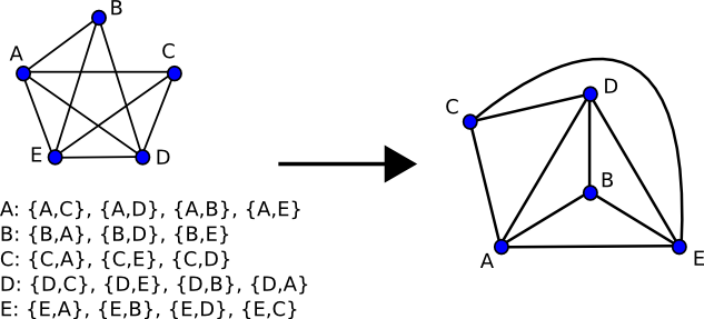 A planar graph (top left), along with a planar embedding of that graph (bottom left) can be used to create a plane drawing (right) by embedding edges around each vertex in the order in which they appear in the planar embedding.