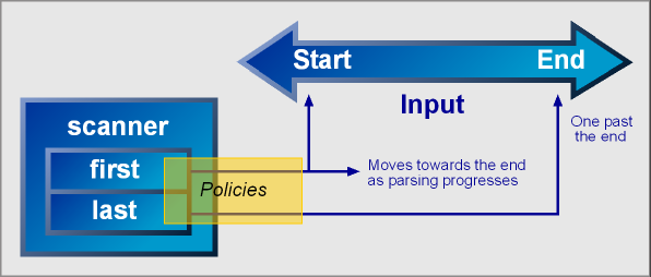 The scanner's task is to feed the sequential input data stream to the parser. The scanner extracts data from the input, parceling, potentially modifying or filtering, and then finally relegating the result to individual parser elements on demand until the input is exhausted. The scanner is composed of two STL conforming forward iterators, first and last, where first is held by reference and last, by value. The first iterator is held by reference to allow it to be re-positioned. The following diagram illustrates what's happening: