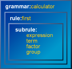 The code above is a good example of the recommended way to use subrules. Notice the hierarchy. We have a grammar that encapsulates the whole calculator. The start rule is a plain rule that holds the set of subrules. The subrules in turn defines the actual details of the grammar.