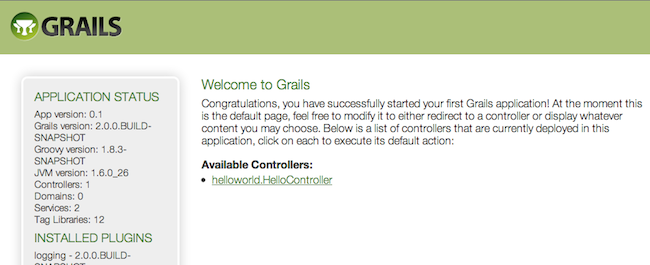 This is the Grails intro page which is rendered by the grails-app/view/index.gsp file. It detects the presence of your controllers and provides links to them. You can click on the "HelloController" link to see our custom page containing the text "Hello World!". Voila! You have your first working Grails application.One final thing: a controller can contain many actions, each of which corresponds to a different page (ignoring AJAX at this point). Each page is accessible via a unique URL that is composed from the controller name and the action name: /<appname>/<controller>/<action>. This means you can access the Hello World page via /helloworld/hello/index, where 'hello' is the controller name (remove the 'Controller' suffix from the class name and lower-case the first letter) and 'index' is the action name. But you can also access the page via the same URL without the action name: this is because 'index' is the default action . See the end of the controllers and actions section of the user guide to find out more on default actions.