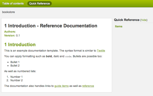 the one for Grails projects. You write your chapters and sections in the gdoc wiki format which is then converted to HTML for the final guide. Each chapter is a top-level gdoc file in the