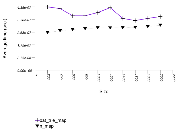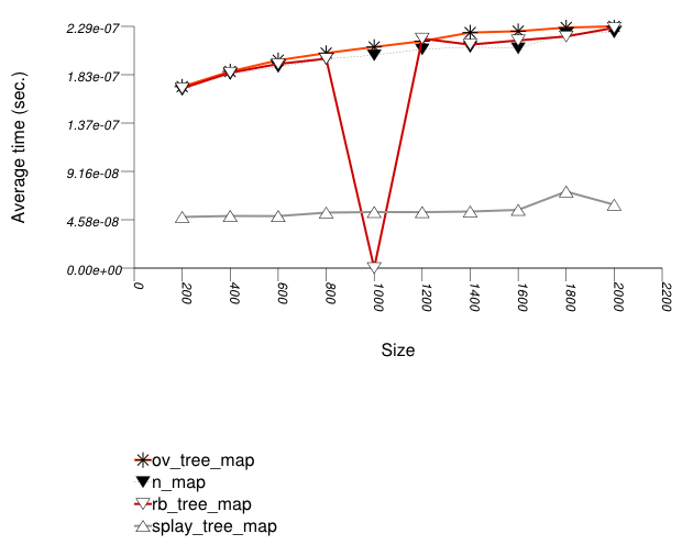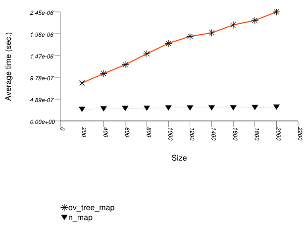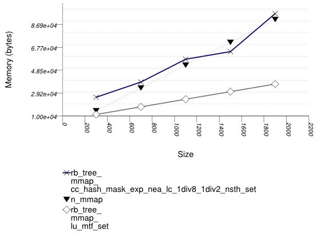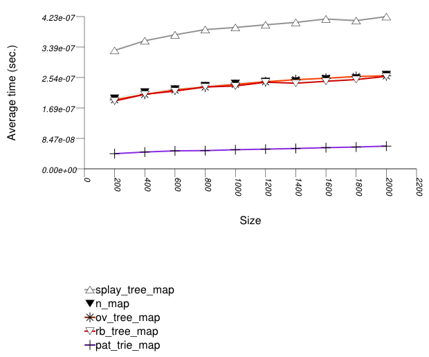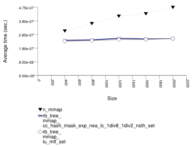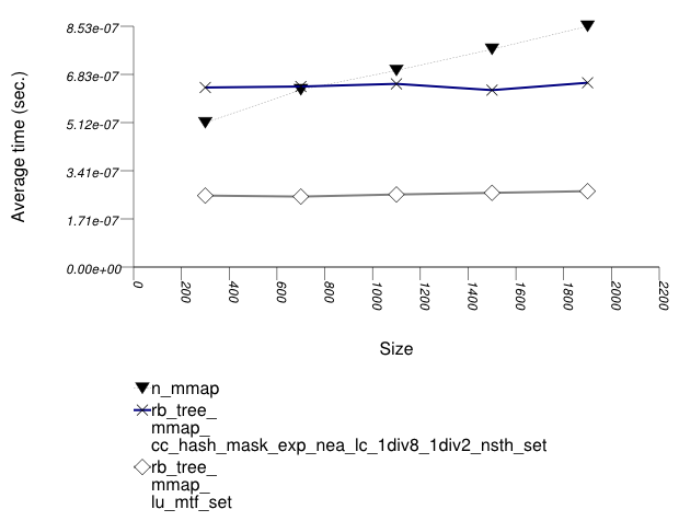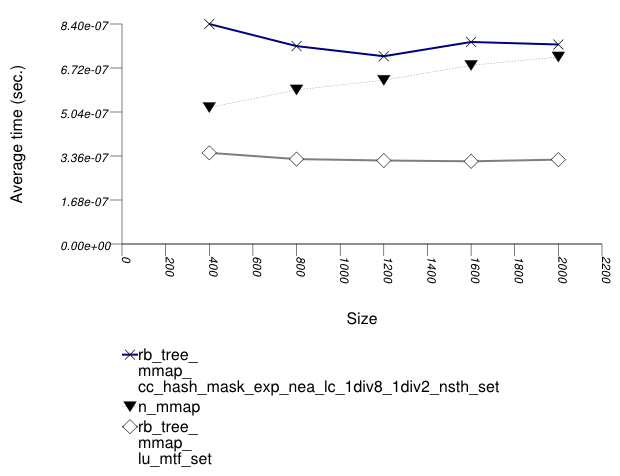 In this setting, the range-hashing scheme affects performance more than other policies. As the results show, containers using mod-based range-hashing (including the native hash-based container, which is currently hard-wired to this scheme) have lower performance than those using mask-based range-hashing. A modulo-based range-hashing scheme's main benefit is that it takes into account all hash-value bits. Standard string hash-functions are designed to create hash values that are nearly-uniform as is ([biblio.knuth98sorting]).