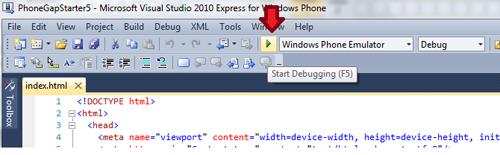 Hit the green play button beside the Windows Phone Emulator drop-down menu to start debugging or press F5.