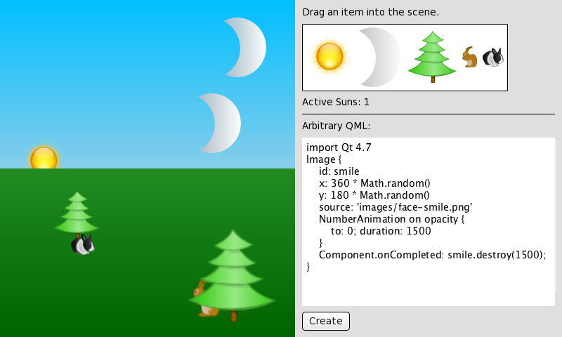 This example presents an interactive drag-and-drop scene. It demonstrates how to use QML's Dynamic Object Creation support to dynamically create and destroy objects.