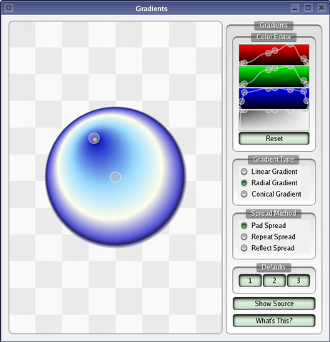 The Gradients demo shows the various types of gradients that can be used in Qt.