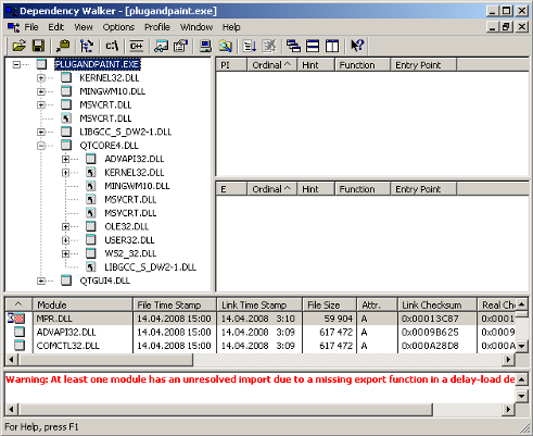 When looking at the release build of the Plug & Paint executable (plugandpaint.exe) with the depends tool, the tool lists the following immediate dependencies to non-system libraries: