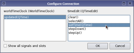 The WorldTimeClock class inherits QWidget, and is a custom clock widget with hour and minute hands that is automatically updated every few seconds. What makes this example different from the Custom Widget Plugin example, is the introduction of the signal and slot in the custom widget class: