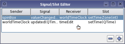 In Qt Designer's workspace we can then, for example, connect the WorldTimeClock widget's updated() signal to a QTimeEdit's setTime() slot using Qt Designer's mode for editing signal and slots.
