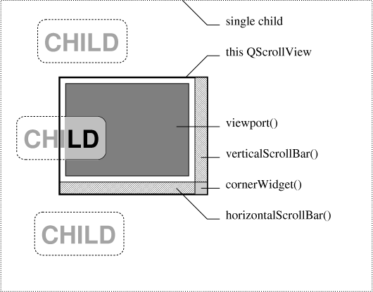 The Q3ScrollView is a large canvas - potentially larger than the coordinate system normally supported by the underlying window system. This is important because it is quite easy to go beyond these limitations (e.g. many web pages are more than 32000 pixels high). Additionally, the Q3ScrollView can have QWidgets positioned on it that scroll around with the drawn content. These sub-widgets can also have positions outside the normal coordinate range (but they are still limited in size).