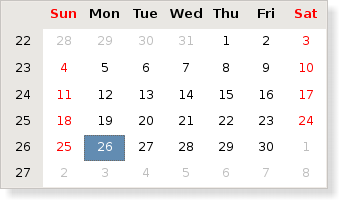 The notation of the days can be altered to a single letter abbreviations ("M" for "Monday") by setting the horizontalHeaderFormat property to QCalendarWidget::SingleLetterDayNames. Setting the same property to QCalendarWidget::LongDayNames makes the header display the complete day names. The week numbers can be removed by setting the verticalHeaderFormat property to QCalendarWidget::NoVerticalHeader. The calendar grid can be turned on by setting the gridVisible property to true using the setGridVisible() function: