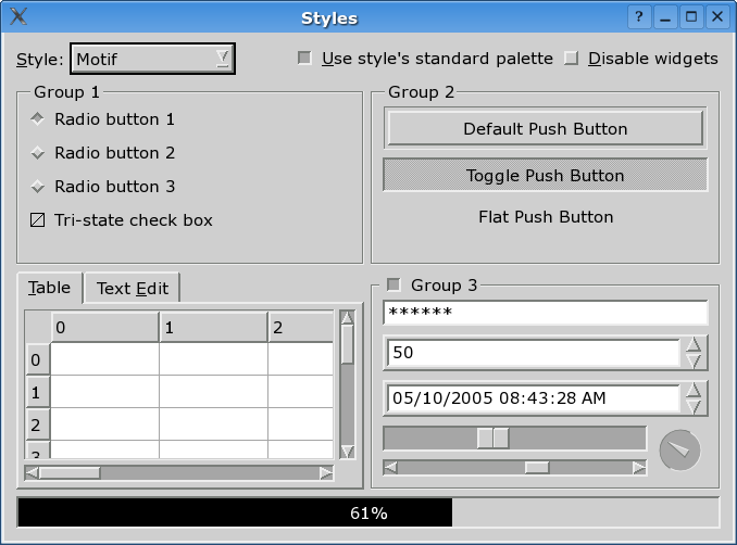 This class implements the Motif look and feel. It closely resembles the original Motif look as defined by the Open Group, but with some minor improvements. The Motif style is Qt's default GUI style on Unix platforms.