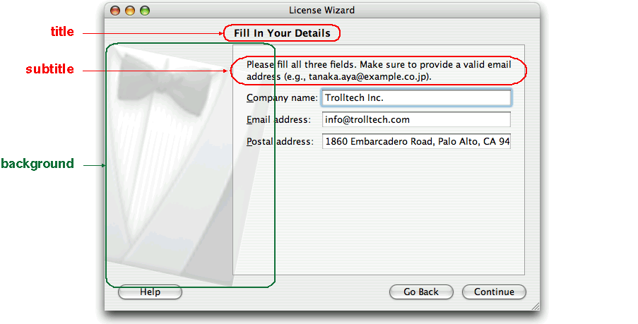 The watermark, banner, and logo pixmaps are ignored by the MacStyle. If the BackgroundPixmap is set, it is used as the background for the wizard; otherwise, a default "assistant" image is used.