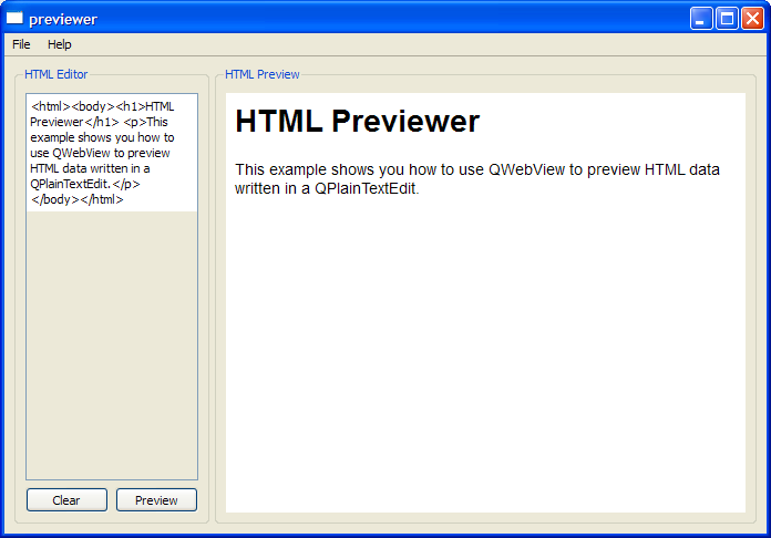 void MainWindow::setStartupText() { QString string = "<html><body><h1>HTML Previewer</h1>" " <p>This example shows you how to use QWebView to" " preview HTML data written in a QPlainTextEdit.</p>" " </body></html>"; centralWidget->webView->setHtml(string); }