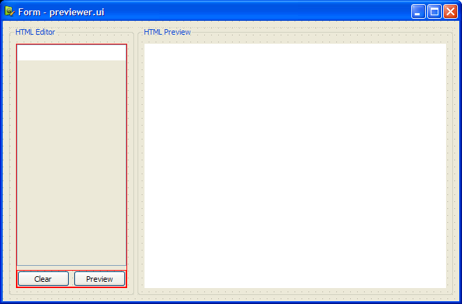 Before we begin, we create a user interface using Qt Designer. Two QGroupBox objects - the editor group box and the previewer group box are separated by a QSplitter. In the editor group box, we have a QPlainTextEdit object, plainTextEdit, and two QPushButton objects. In the previewer group box, we have a QWebView object, webView.