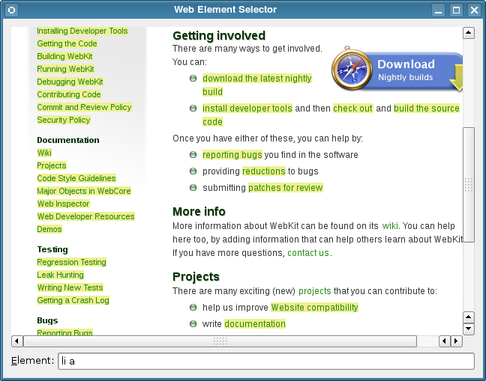 When the application's event loop is run, the WebKit home page will load, and the user can then begin to start running queries against the contents of the page. The highlighting can only be removed by reloading the page. To do this, open a context menu over the page and select the Reload menu item.