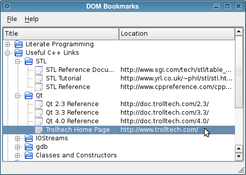 The DOM Bookmarks example provides a reader for XML Bookmark Exchange Language (XBEL) files that uses Qt's DOM-based XML API to read and parse the files.