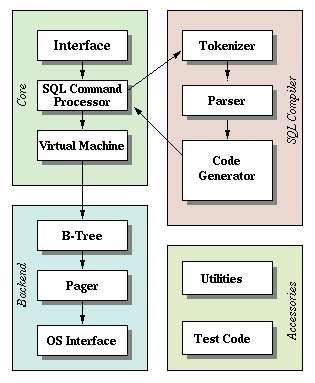 A block diagram showing the main components of SQLite and how they interrelate is shown at the right. The text that follows will provide a quick overview of each of these components.
