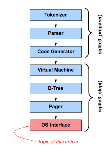 The OS Interface - also called the "VFS" - is what makes SQLite portable across operating systems. Whenever any of the other modules in SQLite needs to communicate with the operating system, they invoke methods in the VFS. The VFS then invokes the operating-specific code needed to satisfy the request. Hence, porting SQLite to a new operating system is simply a matter of writing a new OS interface layer or "VFS".