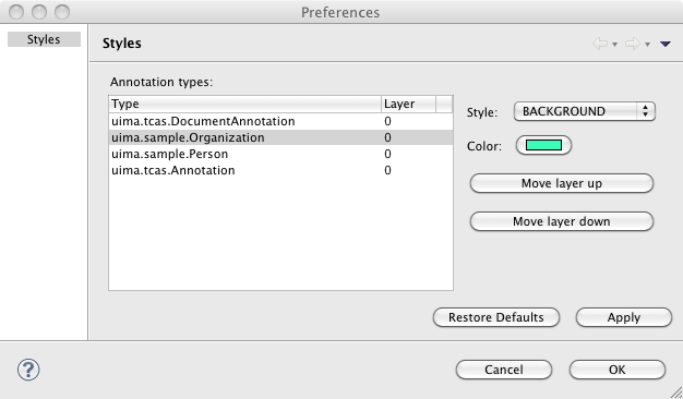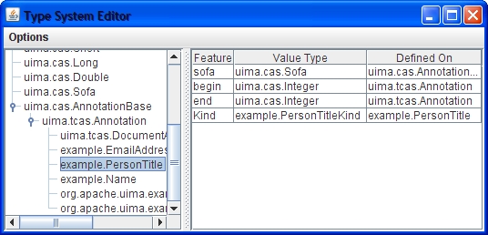 Before discussing this page in detail, it is important to note that there are two settings that affect the operation of this page. These are accessed by selecting the UIMA → Settings (or by going to the Eclipse Window → Preferences → UIMA Preferences) and checking or unchecking one of the following: “Auto generate .java files when defining types” and “Display fully qualified type names.”