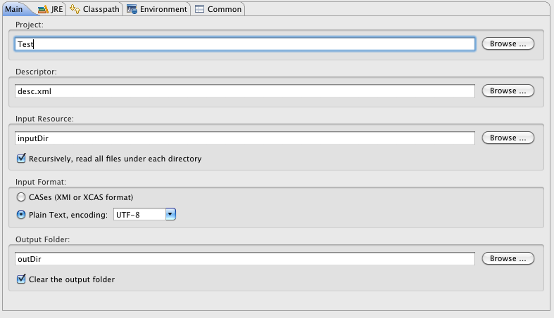 Runtime information is only applicable for primitive engines and is disabled for aggregates and other kinds of descriptors. This is where you specify the class name of the annotator implementation, if you are doing a Java implementation, or the C++ shared object or dll name, if you are doing a C++ implementation. Most Analysis Engines will specify that they update the CAS, and that they may be replicated (for performance reasons) when deployed. If a particular Analysis Engine must see every CAS (for instance, if it is counting the number of CASes), then uncheck the “multiple deployment allowed” box. If the Analysis Engine doesn't update the CAS, uncheck the “updates the CAS” box. (Most CAS Consumers do not update the CAS, and this parameter defaults to unchecked for new CAS Consumer descriptors).